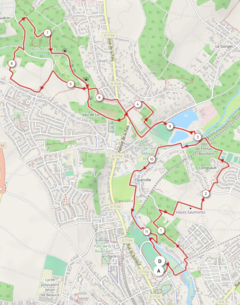 un parcours nature sur 11,5 km, à travers les bois et les champs, empruntant pour l’essentiel chemins, sentes et pistes cyclables, sur les communes de Champhol, Lèves et Saint-Prest. Le parcours est exigeant, avec quelques passages plus techniques !